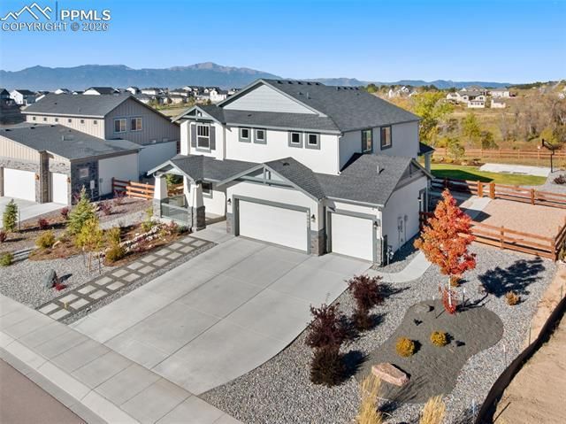 Beautiful like-new 6BD/5BA two-story home on a ½-acre lot with a 3-car garage and fully finished basement in The Retreat at Timber Ridge! Exceptional curb appeal shines with lush landscaping, tranquil water features, stunning Pikes Peak views, and a private basketball court. The main level features a private study and an inviting open-concept design anchored by a spacious family room with a cozy gas fireplace. The gourmet kitchen is a chef’s dream, offering a gas cooktop, stainless steel appliances, walk-in pantry, and a convenient mudroom with drop zone. The dining area opens to a covered patio overlooking the serene backyard water feature—perfect for relaxing evenings or entertaining guests. Upstairs, the expansive primary suite provides a luxurious retreat with an enlarged shower, dual vanities, and a generous walk-in closet. Three additional bedrooms, a full bath, a large loft, and a dedicated laundry room complete the upper level, offering comfort and flexibility for any lifestyle. The finished basement is built for entertaining, featuring two additional bedrooms, two full baths, a spacious recreation room with a second gas fireplace, and a full wet bar—ideal for hosting gatherings or creating the ultimate game and media space. Blending style, space, and functionality in a highly sought-after community, this exceptional property offers refined living inside and out.