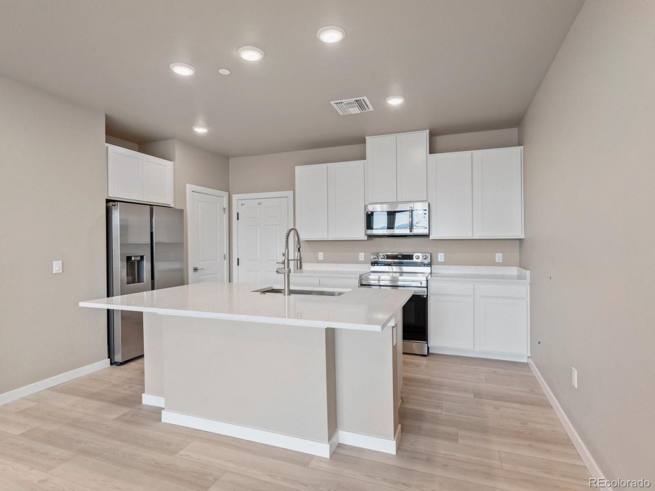 Experience low-maintenance living in the thoughtfully designed Vyktorea I floor plan in Gateway Commons, offering 3 bedrooms, 2 bathrooms, and 1,252 square feet of functional, modern living space in Denver with convenient access to Denver International Airport, Downtown Denver, and major commuter routes. This rare opportunity features the last available ground-floor 3-bedroom home and is an end unit, providing added privacy, natural light, and desirable separation from neighboring residences. The open-concept layout creates a natural flow between the kitchen, dining, and great room, making everyday living and entertaining effortless. The well-appointed kitchen features a large center island, pantry storage, white quartz countertops, Samsung appliances, and Kohler fixtures, combining style with practicality. The bright living area opens directly to a private patio, creating a seamless indoor-outdoor connection. The primary suite is thoughtfully positioned for privacy and includes a walk-in closet and a private bathroom with modern finishes and lighted mirrors. Two additional bedrooms provide flexible options for guests, a home office, or additional living space, while a conveniently located laundry area enhances everyday functionality. Situated on the first floor with direct access to a private garage, this end-unit home offers both convenience and ease of living in Gateway Commons, a desirable Denver community close to Denver International Airport and Downtown Denver, providing easy access to commuting, travel, dining, and entertainment while maintaining a comfortable residential setting.